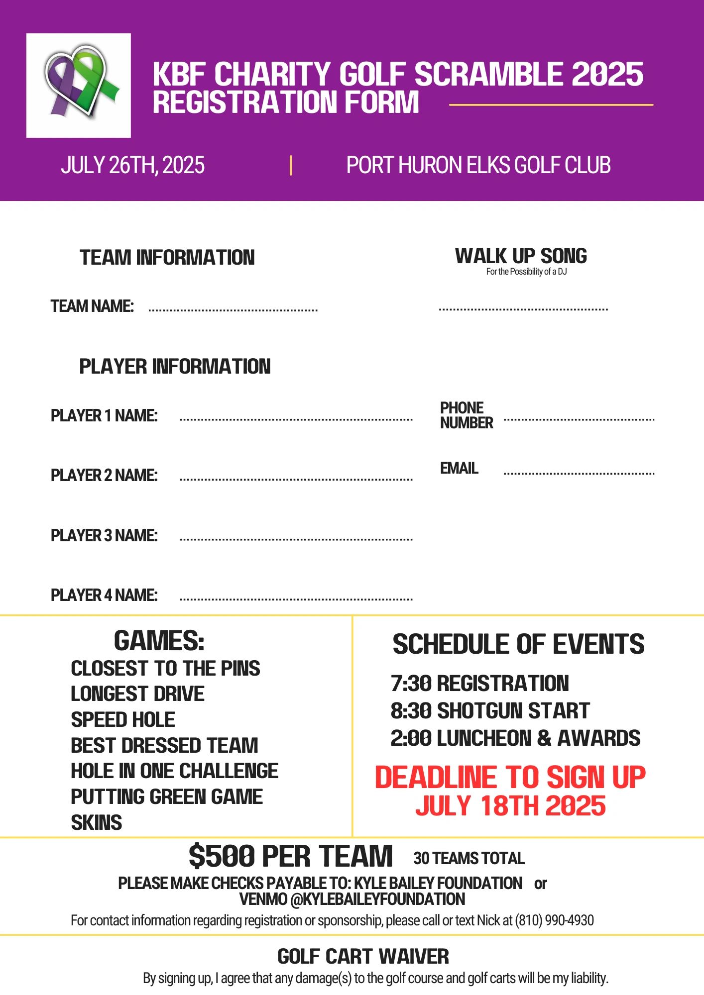 Registration is open! Information for signing up is in the form to the left. Deadline to sign up is July 18th, 2025. Just email nbailey@kylebaileyfoundation.org the information and you will be in!